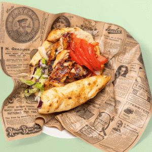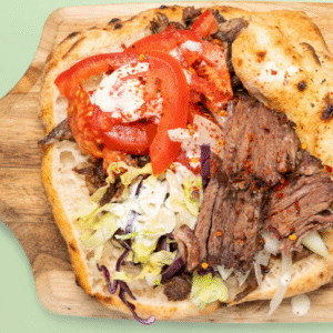 Pain maison, sauce yahourt au sumac, cruditées fraiches, viande veau, poulet mixte – Homemade bread, sumac yogurt sauce, fresh raw vegetables, veal – chicken – mixed meat
