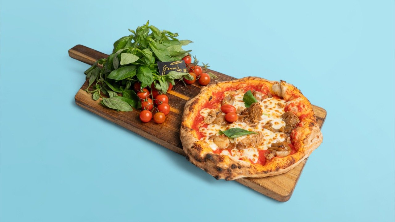 Sauce tomate san Marzano Dop, mozzarella fiordilatte, thon, oignons, huile d’olive extra vierge et basilic frais