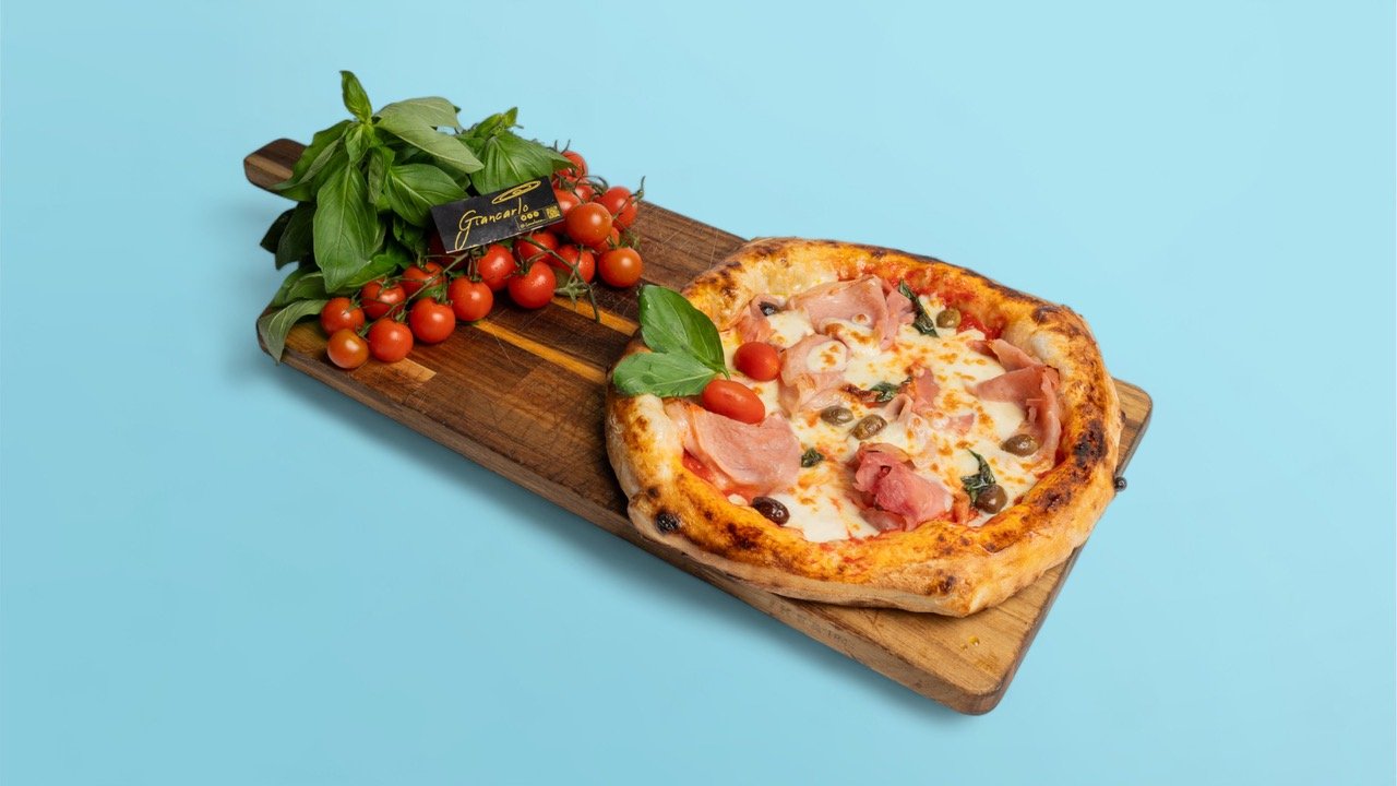 Sauce tomate San Marzano Dop, mozzarella fiordilatte, huile d’olive extra vierge, basilic frais, olives et jambon